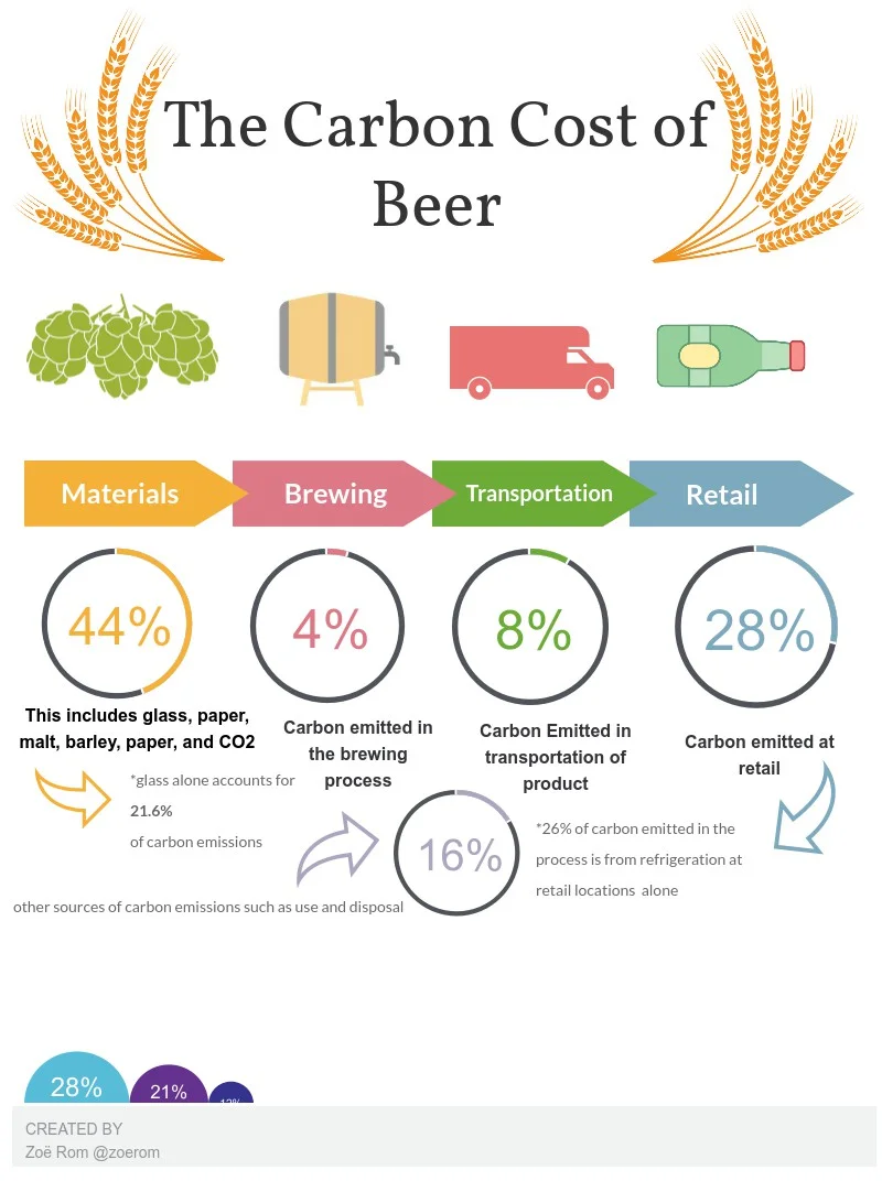While there are many factors that contribute to the carbon cost of beer, the largest are the transportation and refrigeration required at off-plant retail.